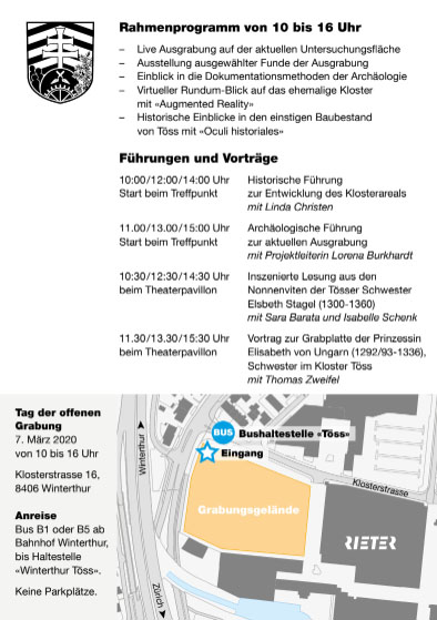 2020. márc. 7-én egyedülálló történelmi tárlatvezetésen, előadáson vehetnek részt az érdeklődők a kolostorról, Boldog Erzsébetről Winterthurban (a város elején lévő építkezésnél, Winterthur-Töss-ben)  Kanton Zürich építési és archeológiai hivatala szervezésében.