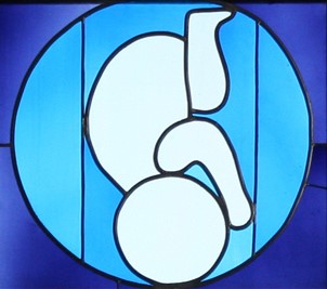 De itt még valami nagyon jelentős dologra felhívja a figyelmet a művész. Hol lett Isten emberré? Betlehemben? Nem, ott született Jézus. De az emberrélevés nagy csodája nem a születés, hanem a fogantatás, tehát Názáret. Názáretben lett Isten emberré lett. Ezen a képen világosan látható erre a különbségre való felhívás: az Istenember nincs még megszületve, az anyaméhben van. És ez az igazi csoda. - A kék szín dominál. Először a kék színe Máriát jelenti (milyen jó Mária-ünnepeken kék miseruhát használni, ha van…) De a keresztény szimbolikában a kék szín gyakran Krisztus színe is, ebben Mária és Jézus szoros kapcsolatát is láthatjuk. Végül a kék szín a keresztény hagyományban a hit színe is. Ránézve a képre: hitre van szükségünk, hogy felismerjük ezt a nagy csodát, az emberrélevést (Menschwerdung a kép címe) és az Eucharisztia hasonló csodáját is.