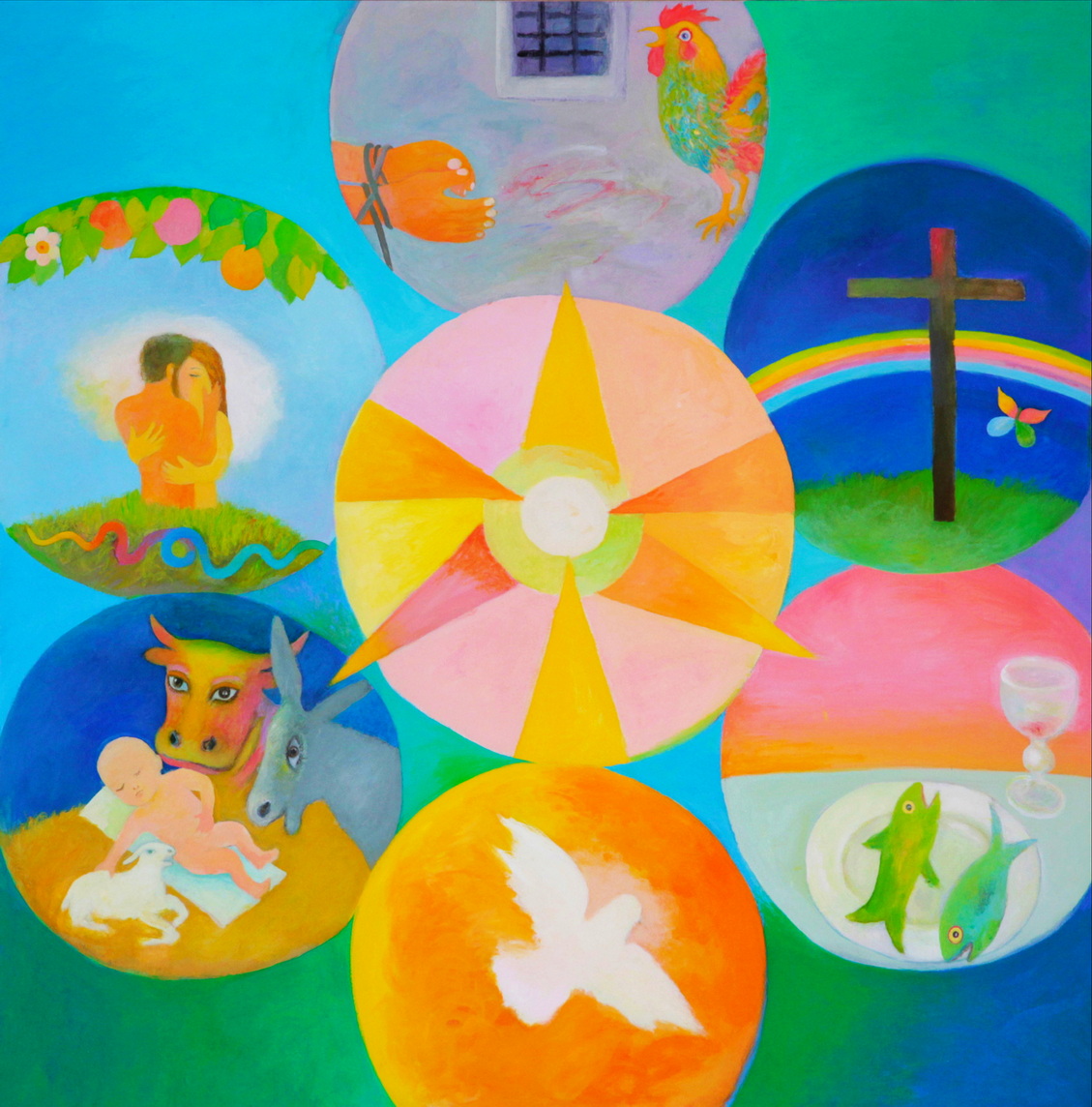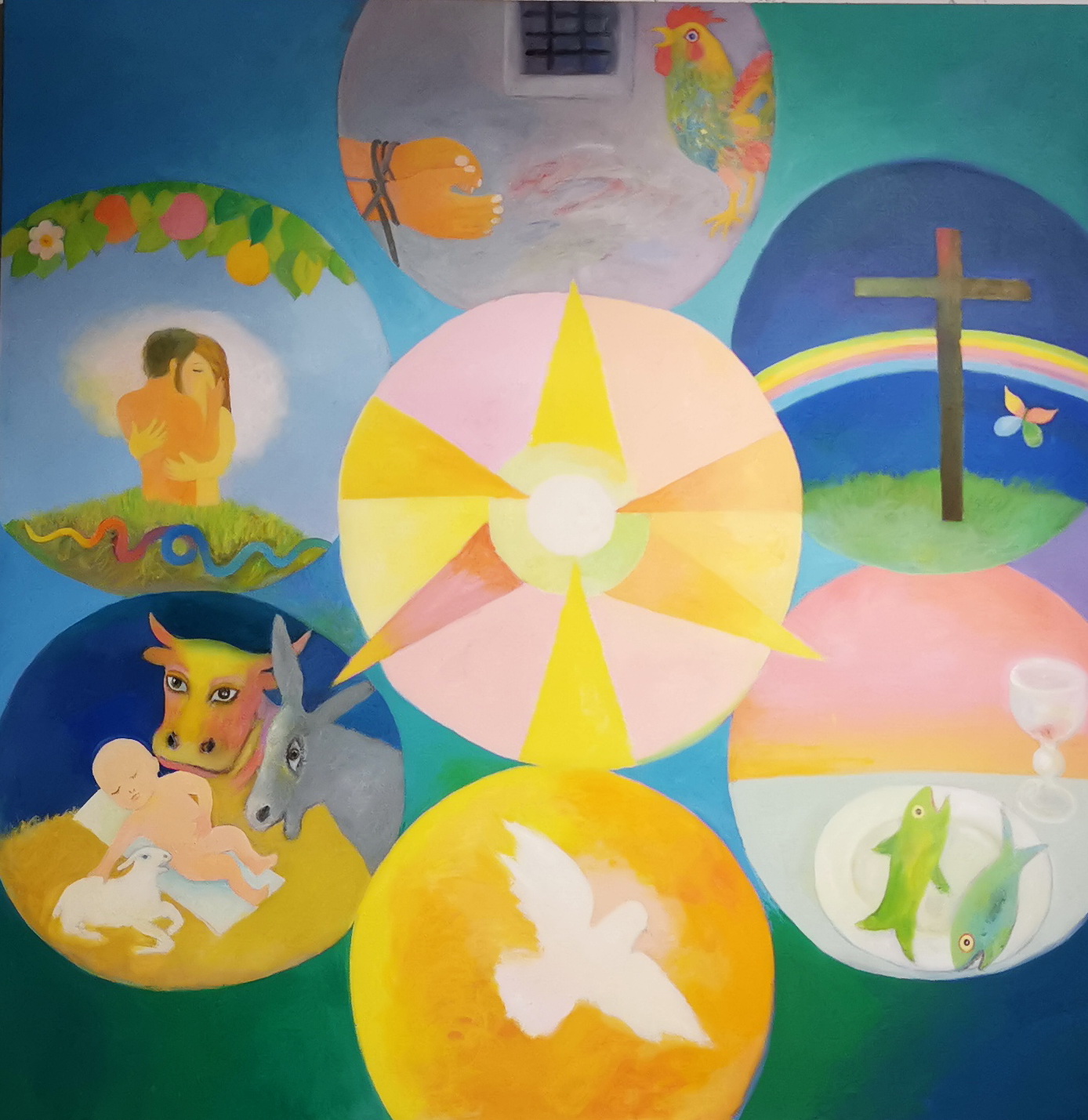 Időzzünk el most az Eucharisztia-képénél. Ha visszaemlékezünk, az eredeti elmélkedő képen egy szentmise jelenete látható. Itt egy napfelkelte háttérnél két hal és egy üvegkehely. Az Eucharisztia megszokott jelképei a kenyér és a bor. A művész ezzel több dolgot is tud üzenni nekünk, hogy ő másként ábrázolta az utolsó vacsora lényegét, illetve a szentmise-jelenetet, illetve az Eucharisztia jelképeit: