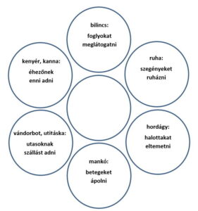 A meditációs képen az irgalmasság 7 (testi) cselekedetei közül 6-ot láthatunk. Ennek oka az lehet, hogy Máté evangélistánál (Mt 25,35kk) csak hatot találunk, de később a keresztény hagyomány kiegészítette egy hetedikkel, a „halottakat eltemetni” cselekedettel, amelyet a Bibliában a Tóbiás 17. fejezetében találunk.