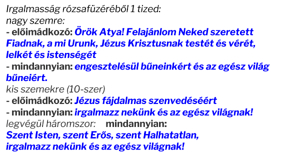 Mi is járuljunk elé, és most az irgalmasság rózsafüzérének egy tizedével fejezzük be: