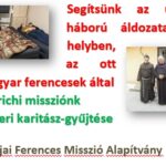 | 2024. november:  Összefogás az ukrajnai háború áldozatai szenvedéseik enyhítésére, szegény családoknak: – gyűjtés meghirdetése kattints ide – köszönő levél a ferencesek alapítványától – ide kattints – beszámolónk a 2024/11. hírlevélben – ide kattints…  | |